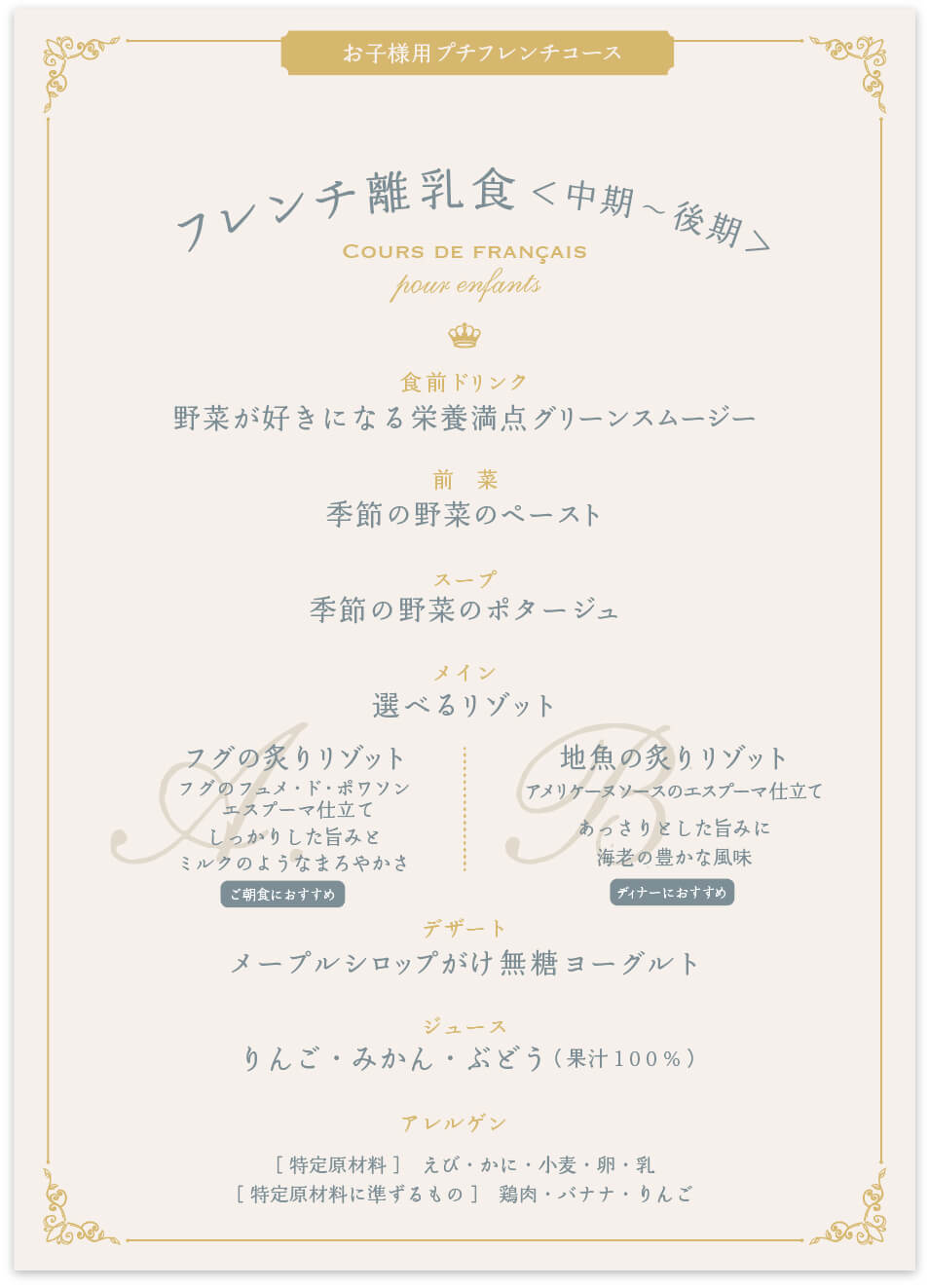 しっかり召し上がるお子様には、フレンチ完了食をご注文いただけます。